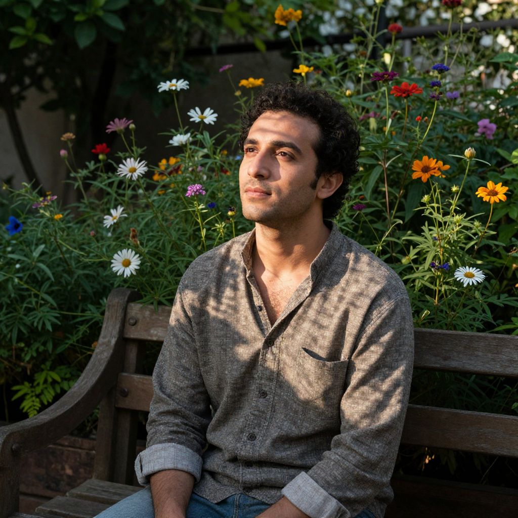 Photograph of a young man with curly dark hair and light olive skin, seated on a wooden bench in a lush garden. He wears a grey, long-sleeved, button-up shirt with rolled sleeves. Sunlight filters through the leaves, casting dappled shadows on his face and shirt. Behind him, a vibrant array of colorful flowers, including white daisies, red, yellow, and purple blooms, fills the background. The man looks slightly to the right with a calm, thoughtful expression. The garden setting is rich with green foliage, creating a serene and picturesque atmosphere.