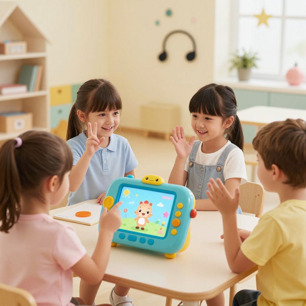 A bright photograph of four young children, three girls and one boy, sitting around a white table in a colorful, sunlit classroom. The girls have dark hair in pigtails, one wearing a blue polo and the others in white shirts with denim overalls. The boy, with brown hair, wears a yellow shirt. They all smile and wave, focused on a blue, toy-style tablet displaying a cartoon character. The background features soft, pastel-colored shelves, a window with light streaming in, and a black musical note decoration on the wall. The children's expressions are joyful and engaged.