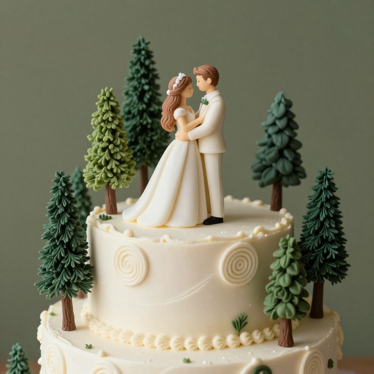 Photograph of a wedding cake featuring a detailed fondant topper of a brown-haired bride in a white dress and a brown-haired groom in a white suit, kissing. They stand amidst fondant evergreen trees on a white, swirl-patterned cake with pearl-like decorations. The background is a plain, muted gray, highlighting the cake's intricate design and realistic textures of the fondant trees and couple. The cake is two-tiered, with a smooth, creamy white finish.