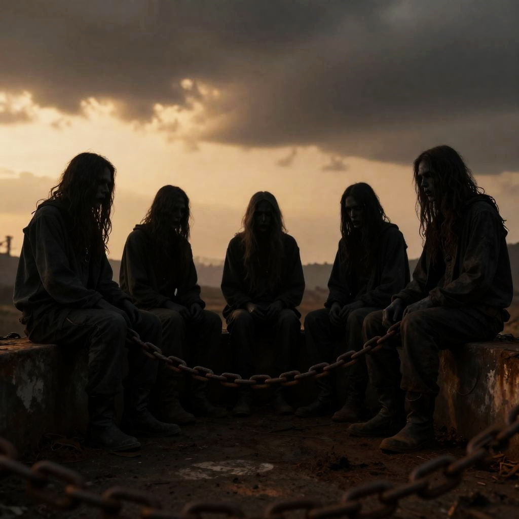 Realistic photo.Five ominous silhouettes sitting around a rusty chain, apocalyptic atmosphere, dark golden hour mood, hyper-realistic, 8K resolution, cinematic lighting, eerie and detailed realistic photo