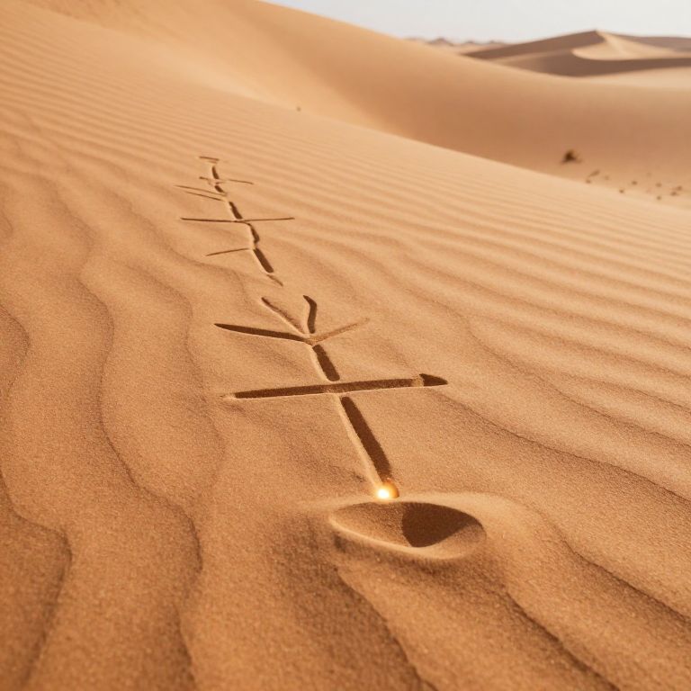 Photograph of a sunlit desert sand dune with a single, large cross-shaped impression carved into the sand, accompanied by smaller, parallel cross-shaped marks leading up to it. The sand has rippled textures, casting shadows from the setting sun. The cross impressions create a distinct visual path, converging towards a small, circular hole in the sand. The warm, golden-orange hues of the sunlight enhance the texture and depth of the sand, creating a serene and contemplative atmosphere. The background is composed of gently undulating sand dunes.