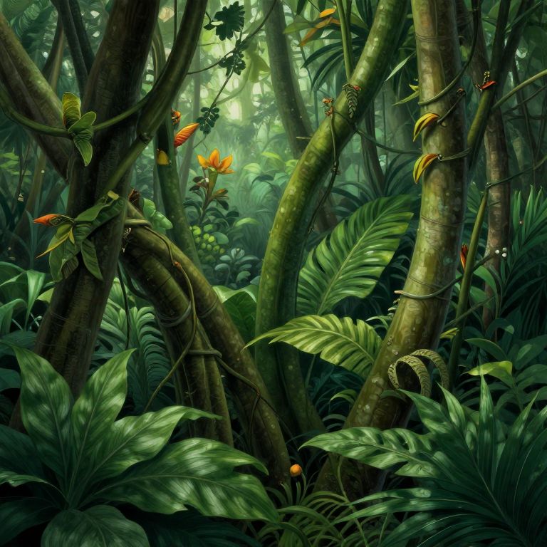 Stems of tropical plants in a dense jungle environment, rich green hues with varying thickness, intertwined with textured leaves and exotic flowers, misty atmosphere with dappled sunlight filtering through the canopy, high detail botanical illustration style.