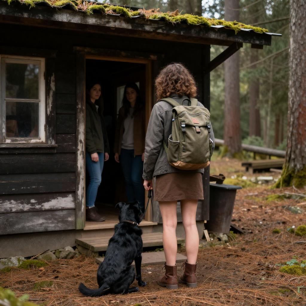 A photograph of a forested cabin. A woman with curly brown hair, wearing a gray jacket, brown skirt, and brown boots, stands with her back to the camera. She carries a green backpack and holds the leash of a black dog sitting at her feet. Two people stand in the cabin's doorway, partially visible. The cabin is weathered with moss and trees surround it. The ground is covered in pine needles.