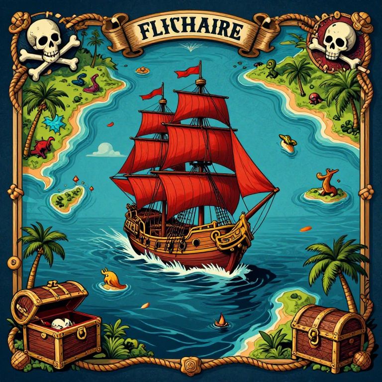 The image presents a vibrant, retro 80's style fantasy world map, richly detailed and beautifully illustrated. The map is centered on a large, majestic pirate ship with red sails, sailing through the ocean, surrounded by various islands and palm trees. The map is adorned with intricate details, including a skull and crossbones, a treasure chest, and various mythical creatures. The color palette is dominated by deep blues and greens, with accents of red and gold, creating a sense of adventure and mystery. The map is framed by a decorative border featuring ropes and knots, adding to the nautical theme. The overall composition is balanced, with the ship and islands strategically placed to create a dynamic and engaging visual narrative. The map's intricate details and vibrant colors evoke a sense of exploration and discovery, inviting viewers to imagine their own pirate adventures in this fantastical world.