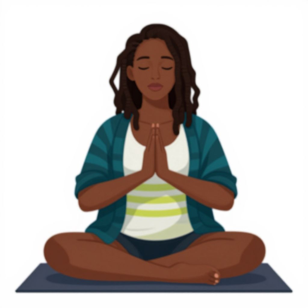 Digital illustration of a dark-skinned woman with dreadlocks, eyes closed, in a blue cardigan and white striped shirt, meditating in a lot