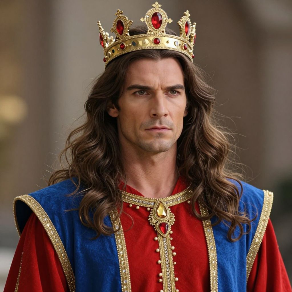 A man with long brown hair and a crown on his head, wearing a blue and red outfit with gold accents. He has a strong, confident presence, with a chiseled facial structure and intense gaze. His long hair flows gracefully around his shoulders, and the crown adds a regal touch to his appearance. The blue and red colors are vibrant and bold, with gold accents that highlight his noble attire. The overall image exudes authority and majesty, capturing a moment of regal dignity and power.