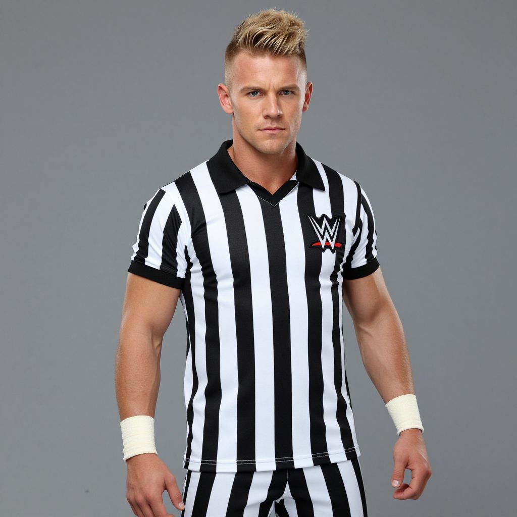 Referee shirt costume wwe, 1boy, male focus, solo, shirt, striped shirt, blonde hair, realistic, wristband, striped clothes