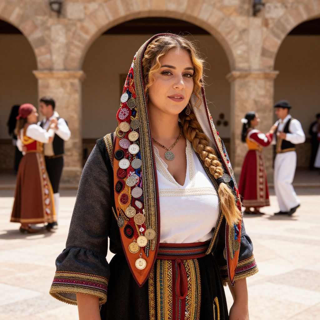 A detailed photo of a woman wearing a traditional Gypsy dancer costume with hand-embroidered coins pinned into her flowing scarves and layered fabrics, her face soft and radiant with earthy warmth, golden braids framing her face, standing beneath an old stone archway in a sun-drenched Spanish-style plaza, surrounded by vintage folk music and dancing figures.. The woman has big tits and cute face