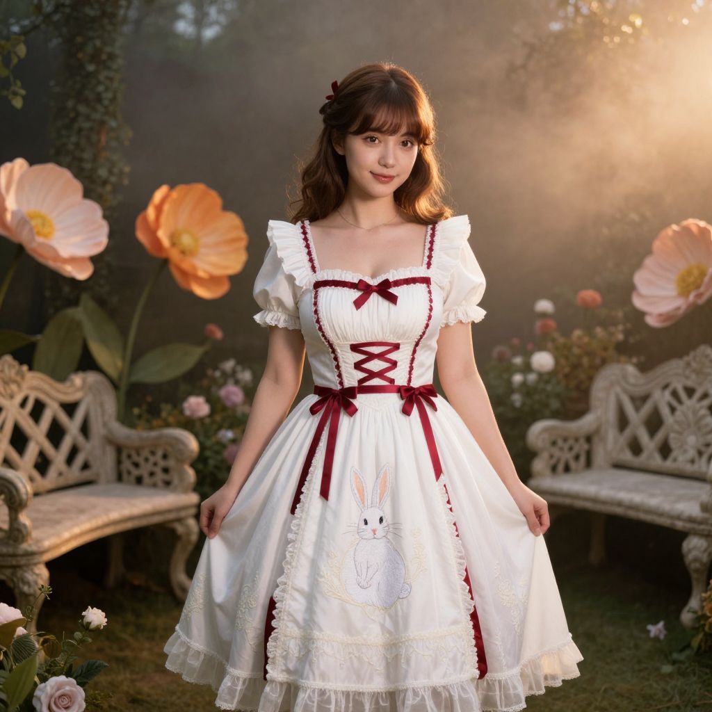 A woman in her late 20s with soft brown hair and warm, friendly eyes wearing an elegant Alice Wonderland dress with a flowing white bodice, red ribbon details, and a large, embroidered white rabbit motif. She stands in a dimly lit, vintage-style garden at sunset, surrounded by oversized flowers and old-fashioned stone benches, with a faint fog in the background, realistic photography style.. The woman has big breasts and cute face