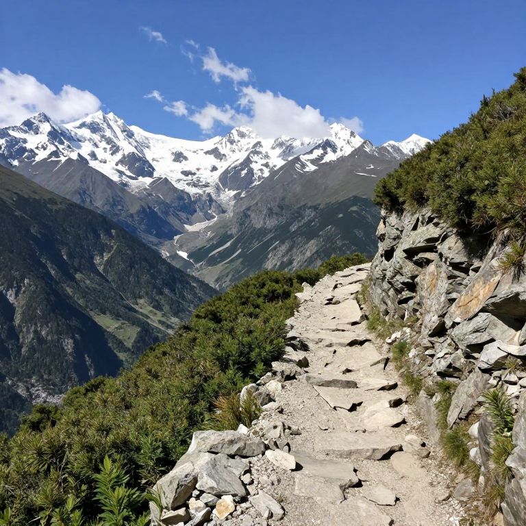 Photograph of a rugged mountain trail ascending a rocky, uneven path on the right, lined with scattered stones and sparse greenery. The trail leads to a lush, forested valley below, surrounded by towering, snow-capped mountains under a clear, vivid blue sky with a few white clouds. The mountains exhibit dark, rocky textures with patches of green forest. The sunlight illuminates the trail and mountains, casting sharp shadows that emphasize the terrain's roughness. The composition captures the majestic, untamed beauty of a high-altitude mountain landscape.