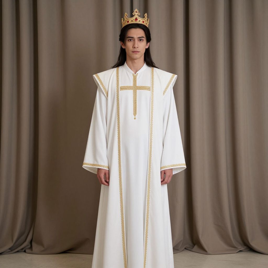 Photograph of a young woman with long black hair and fair skin, standing against a plain gray curtain backdrop. She wears a white, long-sleeved, robe-like garment with gold trim and a cross pattern, and a gold crown adorned with intricate detailing. Her expression is neutral, and she stands with her hands by her sides. The robe's fabric appears smooth and slightly shiny, contrasting with the matte texture of the curtain. The image has a formal, solemn tone, reminiscent of a religious or regal setting.