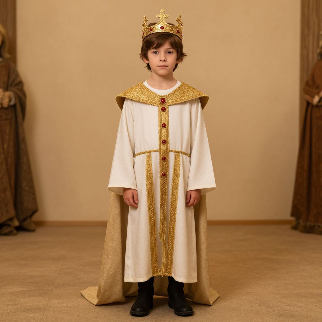 Boy with red hair and blue eyes wearing a brown robe with a rope tied around his waist.