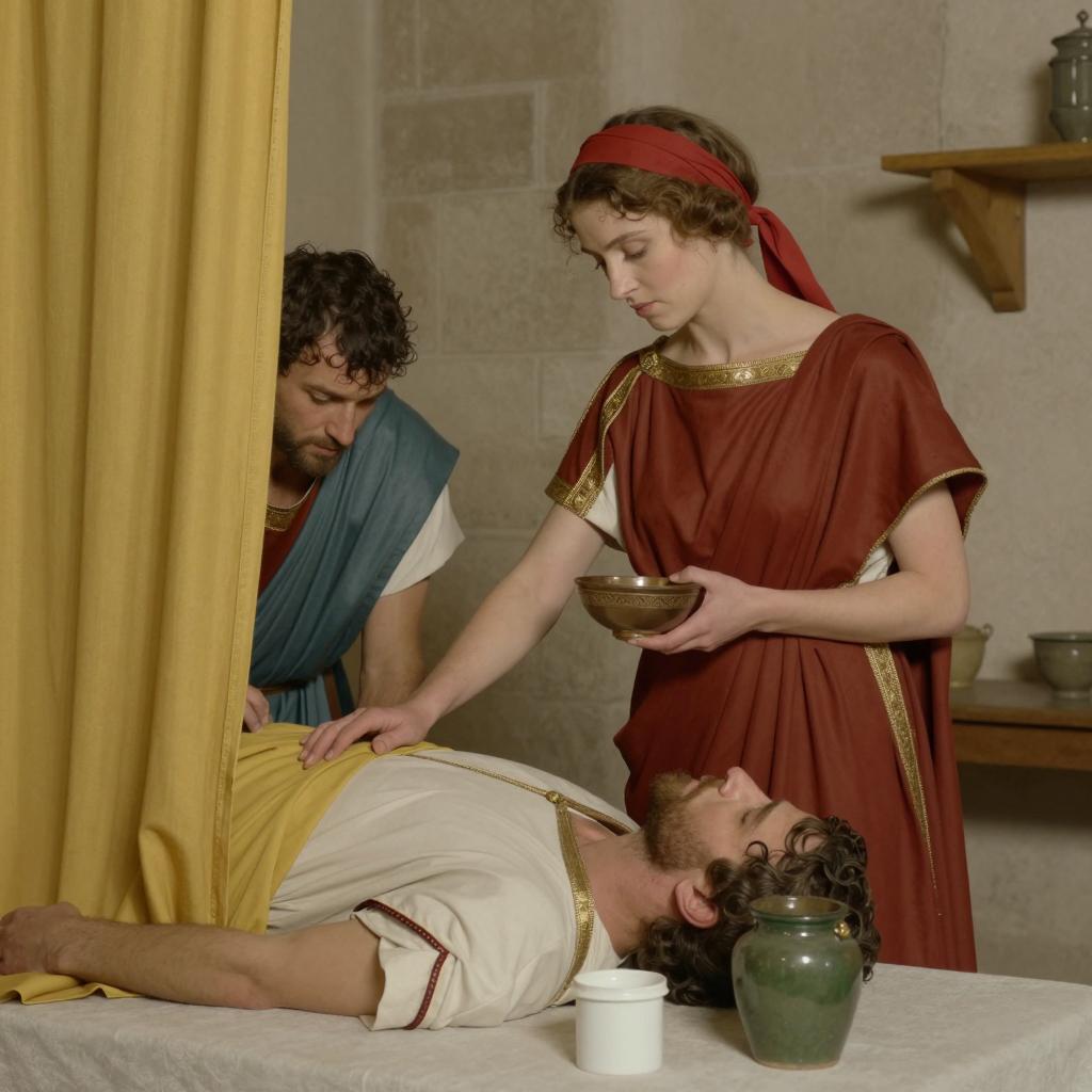 A Roman-style scene. A slender woman with a red headband and red dress holds a small bowl. Two naked men, one standing and one lying on a table, are visible. The standing man is bent over, and the lying man is partially covered by a yellow curtain. A green jar and white container are on the table. The background includes a stone wall and a wooden shelf.