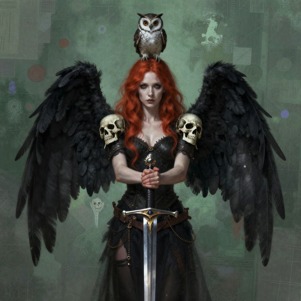 A digital fantasy artwork of a pale-skinned woman with red hair, wearing black feathered wings and skull shoulder armor. She's centered with a sword in front of her, arms crossed. The background is a greenish, textured mix of abstract patterns and colors. Her expression is neutral, and a small owl perches on her head. The style is gothic and surreal.