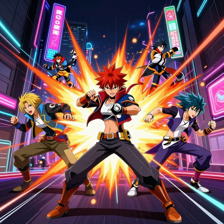 This is a digital anime-style illustration depicting a group of five male characters in a dynamic, action-packed scene. The central character, with spiky red hair and a determined expression, is surrounded by a bright, explosive burst of orange and yellow energy. He wears a black jacket, white shirt, and dark pants with brown boots. To his left, a blond-haired character in a blue jacket and brown pants crouches, ready for action. To his right, a blue-haired character in a white shirt and dark pants is also in a fighting stance. Two other characters, with dark and black hair, are positioned in the background, one above the other, ready to strike. The setting is a neon-lit, futuristic city street at night, with vibrant pink and purple neon signs on tall buildings. The street is dark, with glowing lines running down the center, enhancing the sense of speed and motion. The overall composition is energetic and vibrant, filled with movement and color.