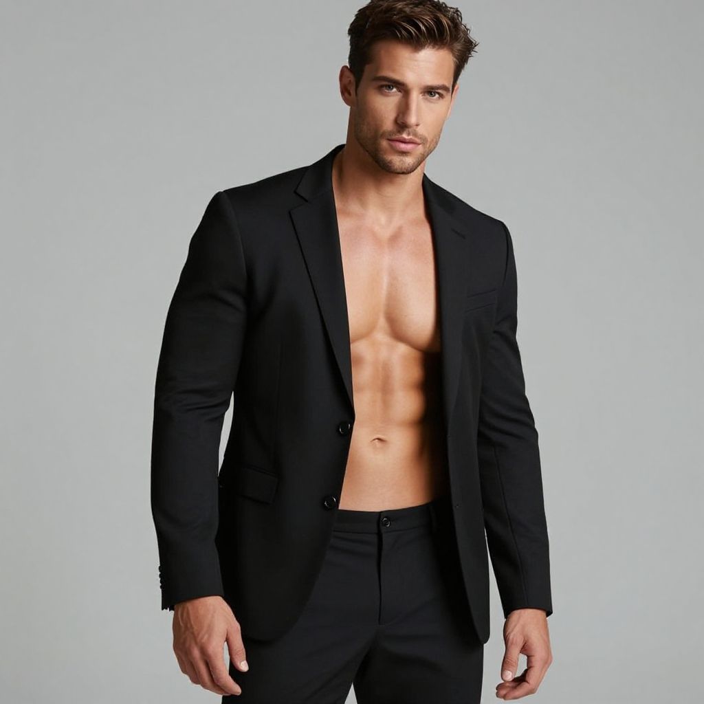 This striking image features a handsome man exuding confidence and style in a sleek black blazer. His toned physique and effortless charm complement the contemporary aesthetic, making it an ideal choice for fashion and lifestyle themes.