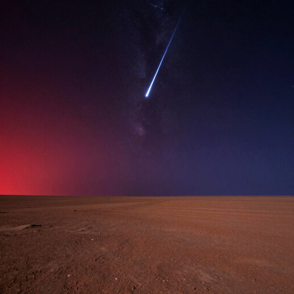 Mars.skyward: detailed close-up of Mars' dusty ground with skyward gaze revealing a meteor shower streaking across the alien sky, vibrant reds and browns contrasted with deep blues and purples, cosmic and contemplative mood