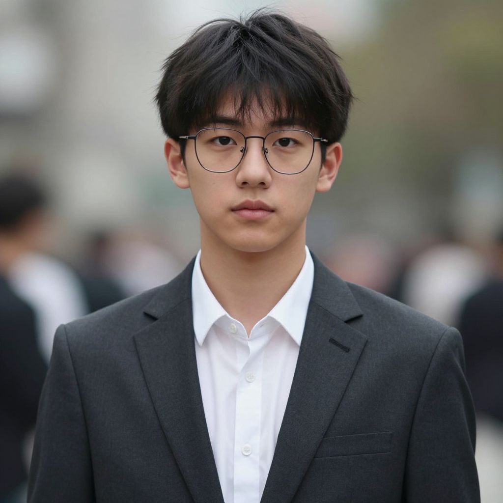 Photograph of a young Asian man with straight black hair and glasses, standing in an urban outdoor setting. He wears a black suit jacket over a white dress shirt, looking directly at the camera with a neutral expression. The background is blurred, featuring indistinct people and muted colors, suggesting a busy street scene. His skin tone is light, and his facial features are soft and youthful. The overall style is modern and professional.