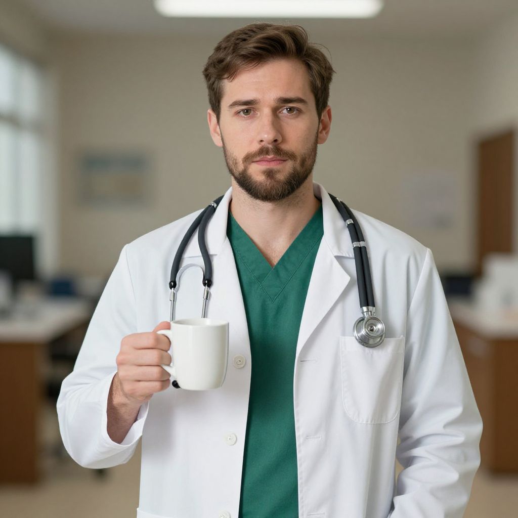 Photograph of a bearded male doctor with brown hair, wearing a white coat over green scrubs, holding a white mug, stethoscope around