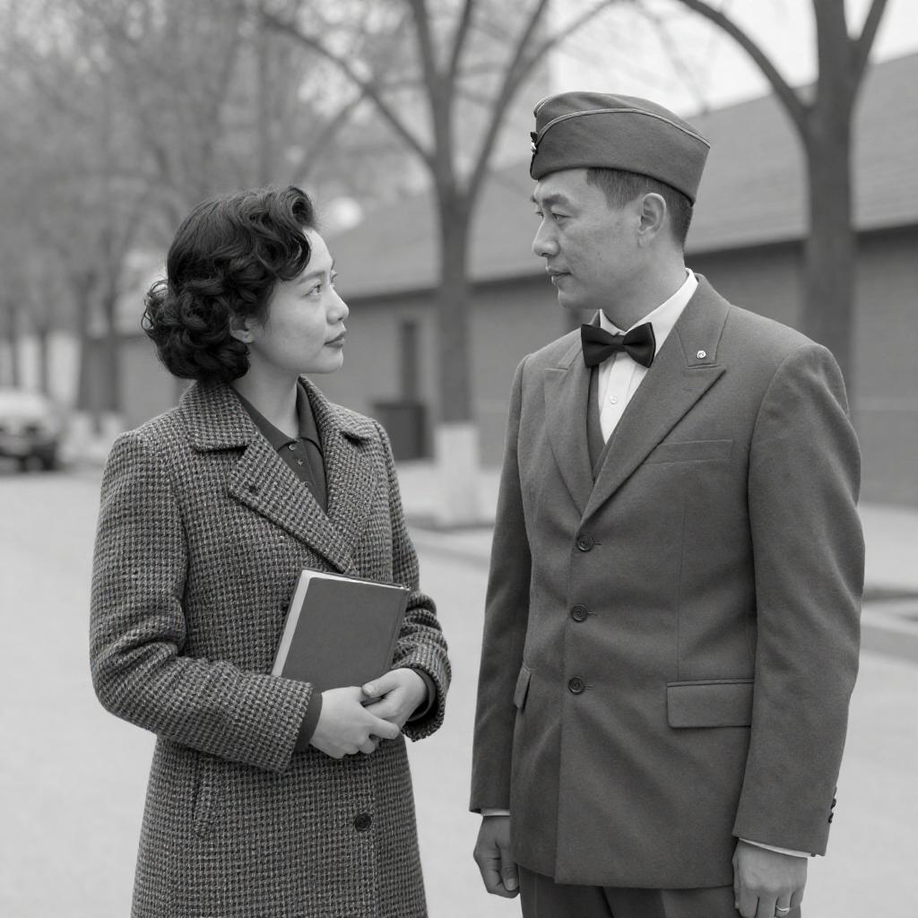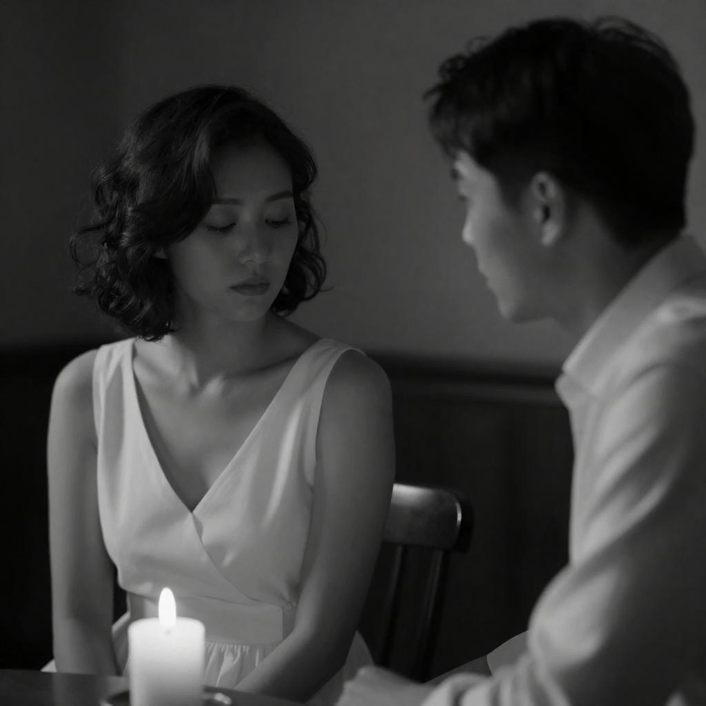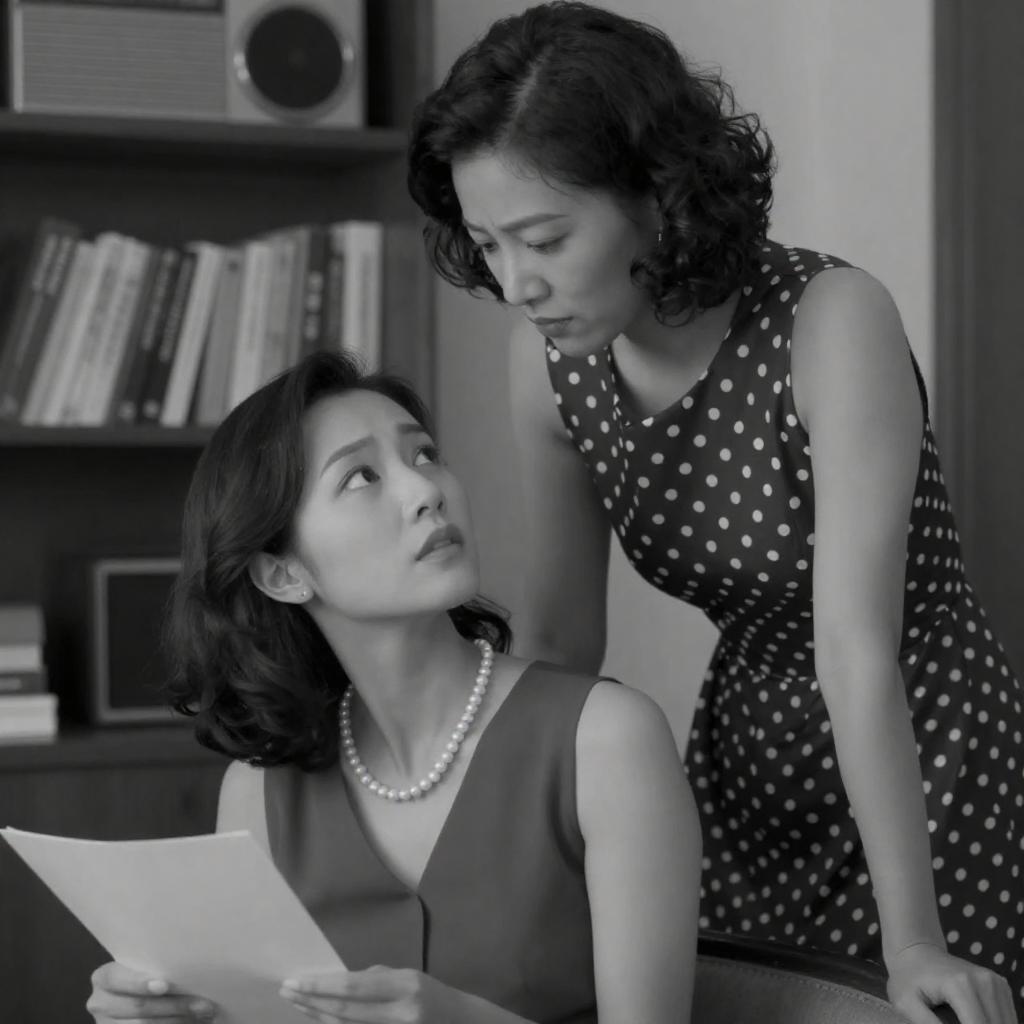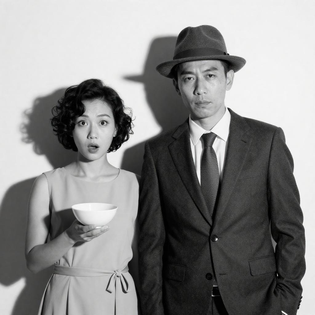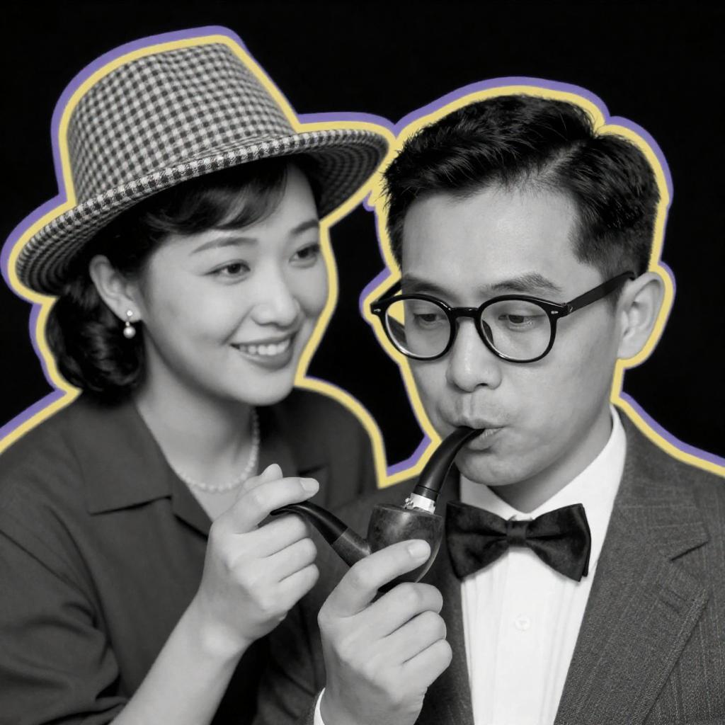 Black-and-white portrait of an Asian man wearing glasses and a bow tie, holding and smoking a pipe, accompanied by an Asian woman smiling and wearing a checkered hat and pearl earrings. Both stand against a black background with a bright purple and yellow outline highlighting their figures.