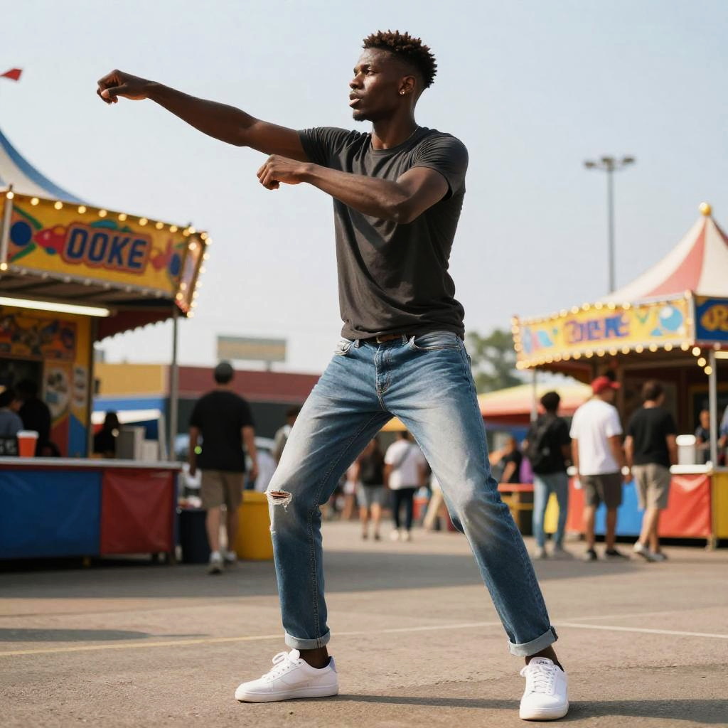 Full body shot of a tall Black male dancer performing a dynamic pose outdoors at a carnival. He is wearing stylish light blue ripped jeans, a fitted black t-shirt, and white sneakers. The background shows carnival game booths with colorful tents and people walking around on a clear day.