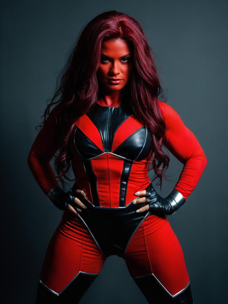 Woman cosplay. Wearing Red She-Hulk costume. Realistic photo. Dressed as Red She-Hulk --sref 1399