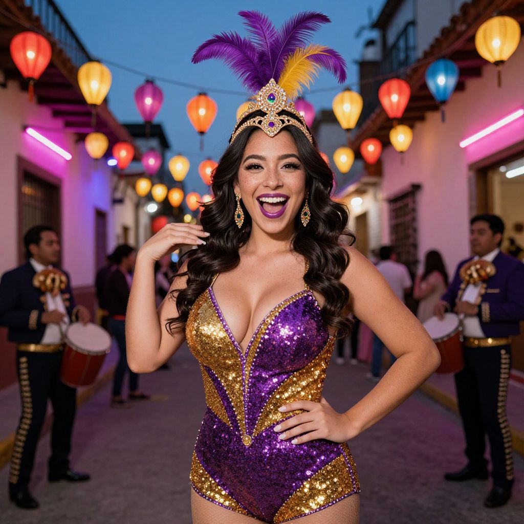 A joyful fiesta party wear costume combining a sequined jumpsuit and a feather headdress in purple and gold, worn by a joyful young woman with dark, wavy hair and freckles, laughing while posing in front of a neon-lit street scene in a Mexican neighborhood with mariachi drums and colorful lanterns hung from the rooftops.. The woman has big breasts and cute face
