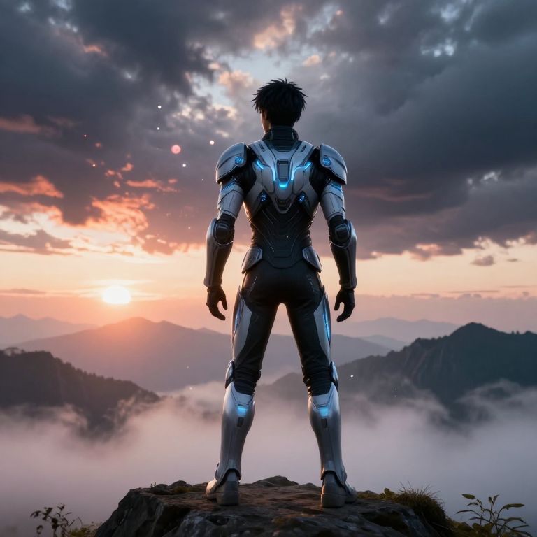 Viszal standing on a misty mountain peak at sunrise, wearing futuristic armor with glowing blue accents, surrounded by ethereal floating particles and dramatic stormy clouds, highly detailed digital art style, cinematic lighting, vibrant colors.