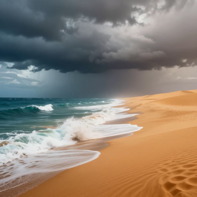 Half and half image illustrating a landscape split between a stormy ocean scene and a peaceful desert, dynamic waves clashing with golden sands, enhanced by rich textures, intense clouds, and warm versus cool lighting effects.