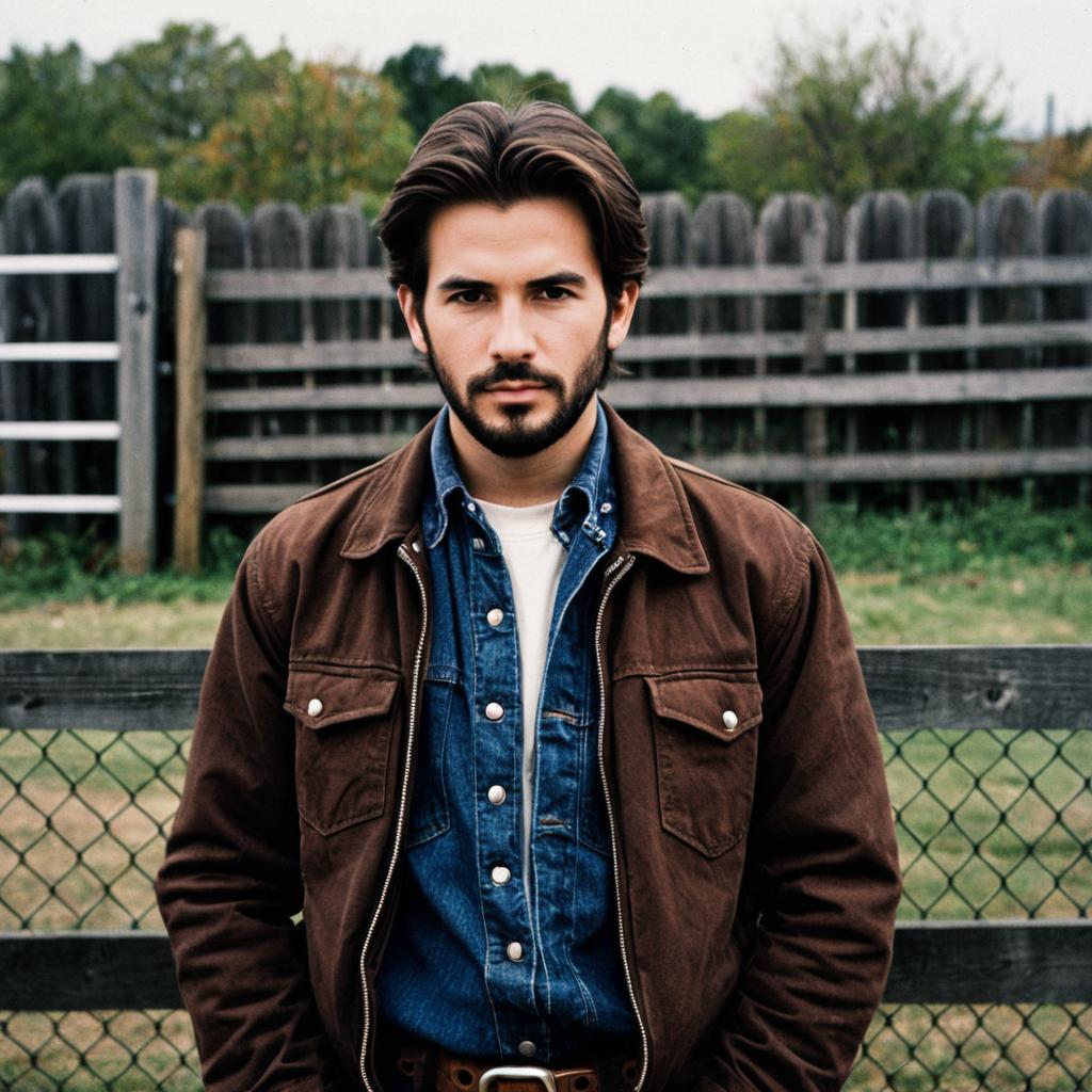 American redneck costume,1boy, male focus, denim, facial hair, solo, hat, jeans, belt, outdoors, baseball cap, watch, realistic, shirt, pants, vest, blurry background, wristwatch, mustache, looking at viewer, beard, blurry, car, white shirt, motor vehicle
