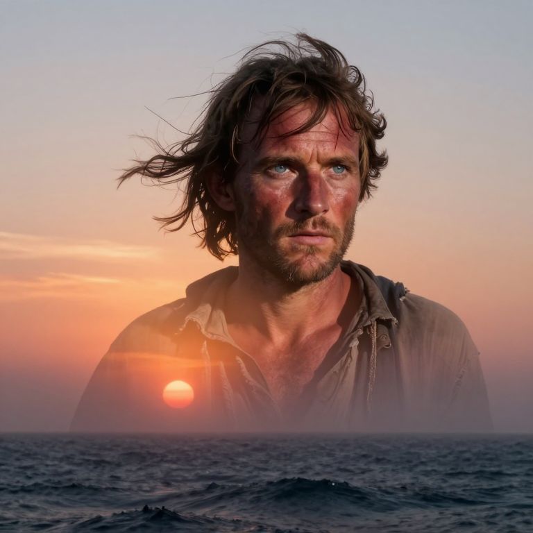 Create an evocative double exposure portrait of a weathered sailor with sun-kissed skin and piercing blue eyes, superimposed over an expansive seascape during sunset. The horizon glows in fiery oranges and pinks while dense fog partially obscures the sailor's silhouette. His tattered clothes sway gently in the salty breeze as his intense gaze pierces through merging layers of ocean mist and sky, evoking a powerful emotional gradient between solitude and wanderlust that invites viewers to embark on an unseen journey.