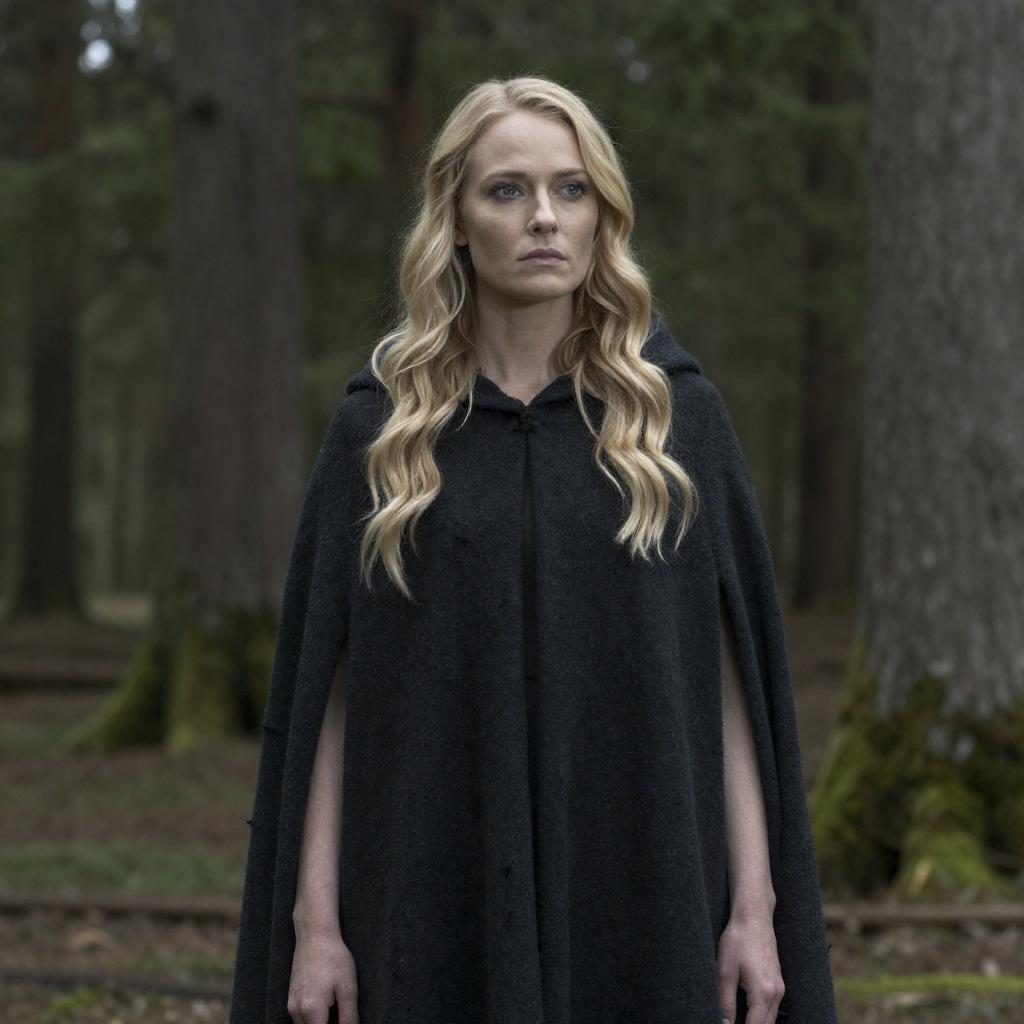 Photograph of a pale-skinned woman with wavy, light brown hair, wearing a dark red velvet hooded cloak. Her face is painted white, giving a ghostly appearance. She stands against a blurred green forest background, looking to the left with a calm expression.