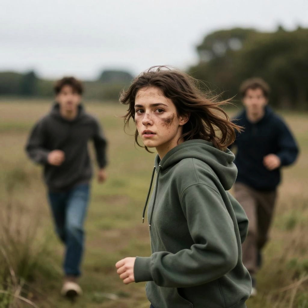 Photograph of a young woman with dirty face and brown hair in motion, looking back with intense expression. She wears a green hoodie. In the background, two men with blurred faces and dark clothing are running. Field with tall grass, cloudy sky, and trees.