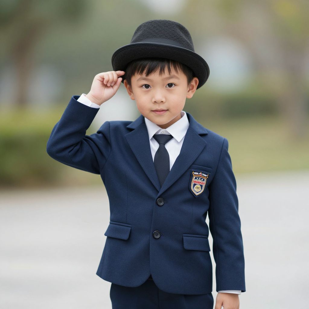 Photograph of a young Asian boy in a dark blue school suit, black tie, and black bowler hat, adjusting his hat outdoors.
