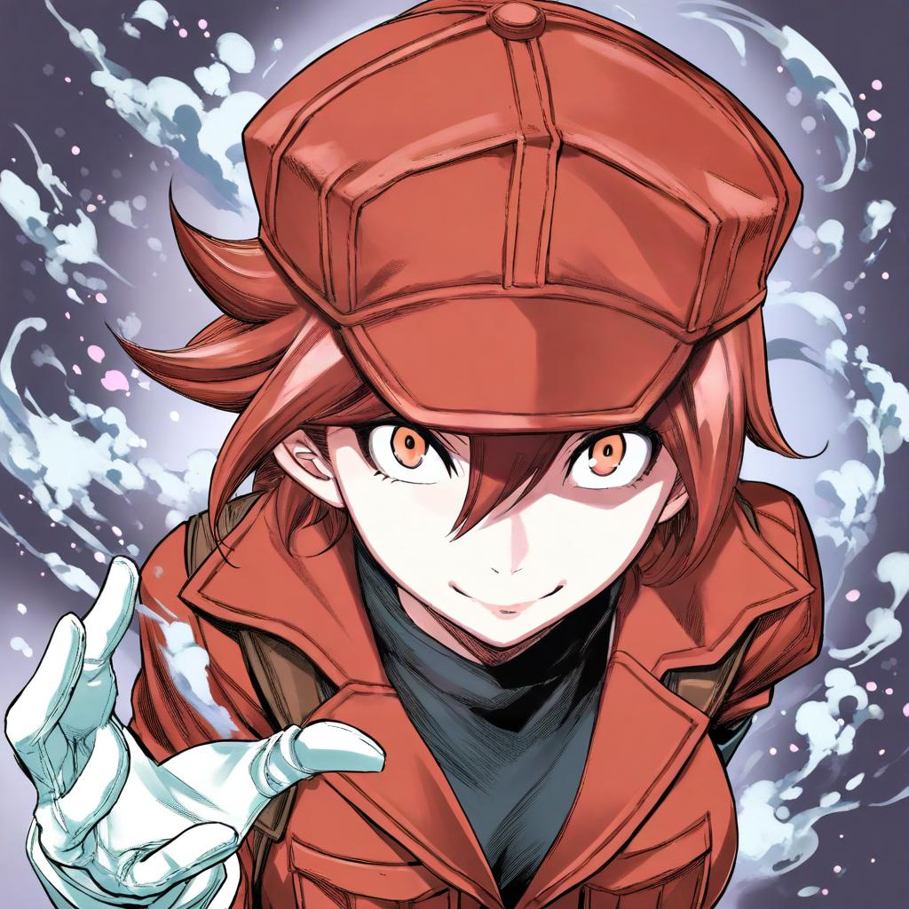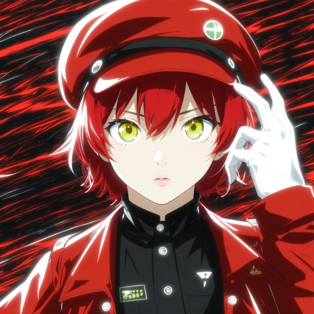 Ae-3803, hataraku saibou, 1girl, yellow eyes, hair between eyes, red hair, short hair, ahoge, medium breasts, cabbie hat, red jacket, white gloves, black shirt, red headwear, by artist d-rex, anime