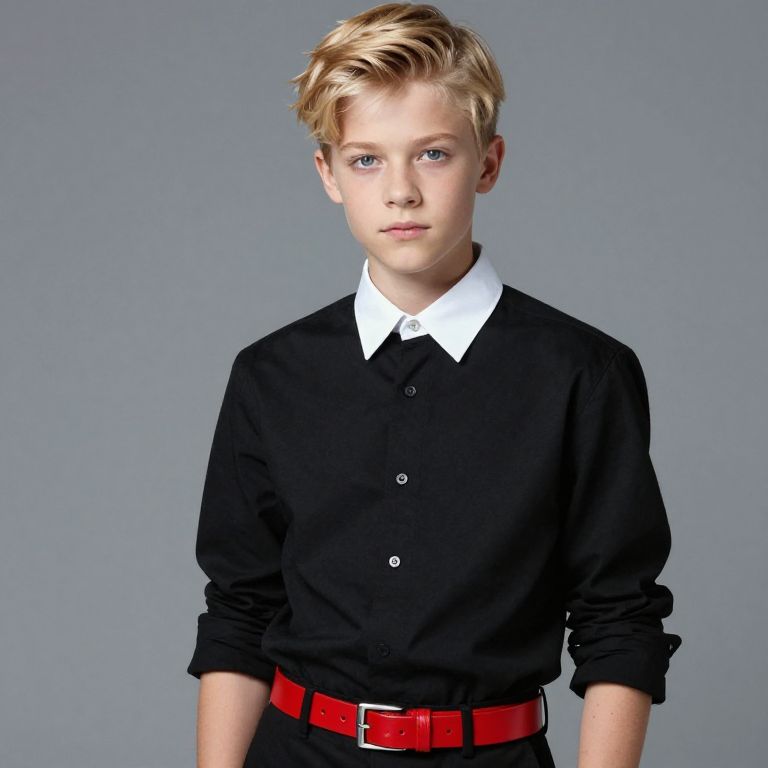 Boy with blonde hair wearing a black shirt with a white collar and a red belt.