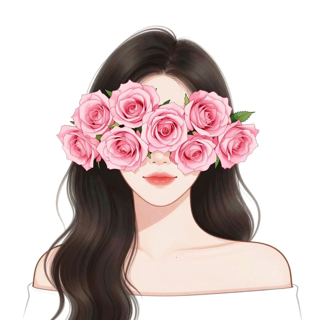 A digital drawing of a woman with long, wavy black hair, partially obscured by a vibrant pink rose bouquet covering her eyes. The background is a clean, bright white, making the pink roses pop. Her expression is subtle, with a hint of a smile. The art style is minimalist, focusing on soft lines and delicate details.