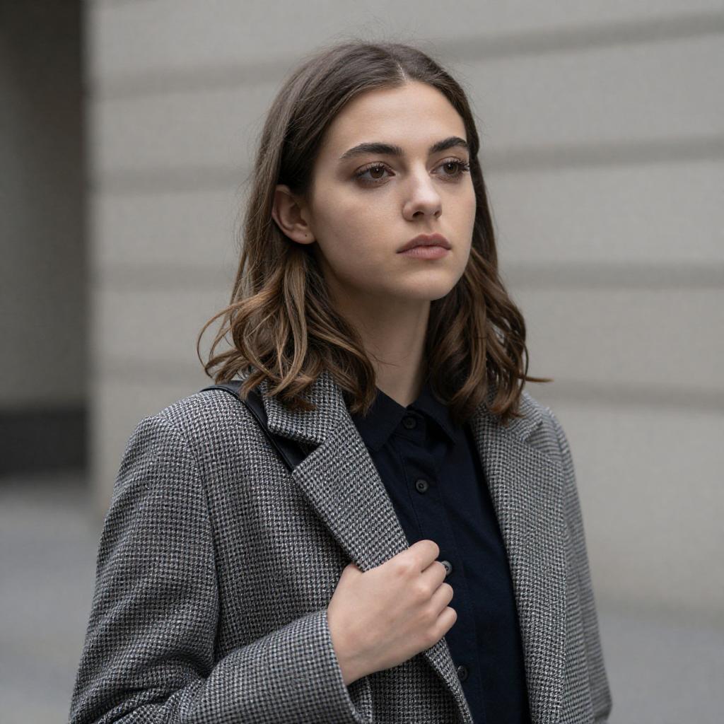 Photograph of a young woman with fair skin and dark hair, wearing a black hat and coat, standing in a dimly lit, rustic bar. She holds a strap, with a blue, sunburst-patterned wall and a wooden bar counter filled with bottles in the background. Her expression is serious and focused.