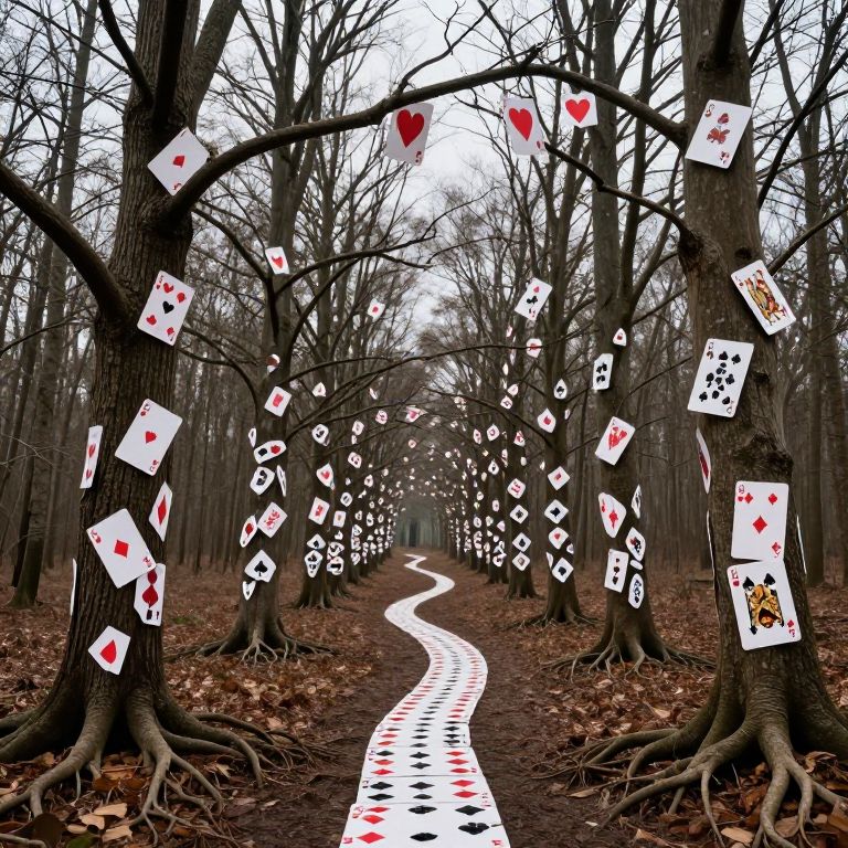 A surreal forest where bare trees sprout playing cards instead of leaves, their branches and roots entwined in an endless cascade of hearts, diamonds, clubs, and spades, creating a whimsical pathway that defies the laws of nature.
