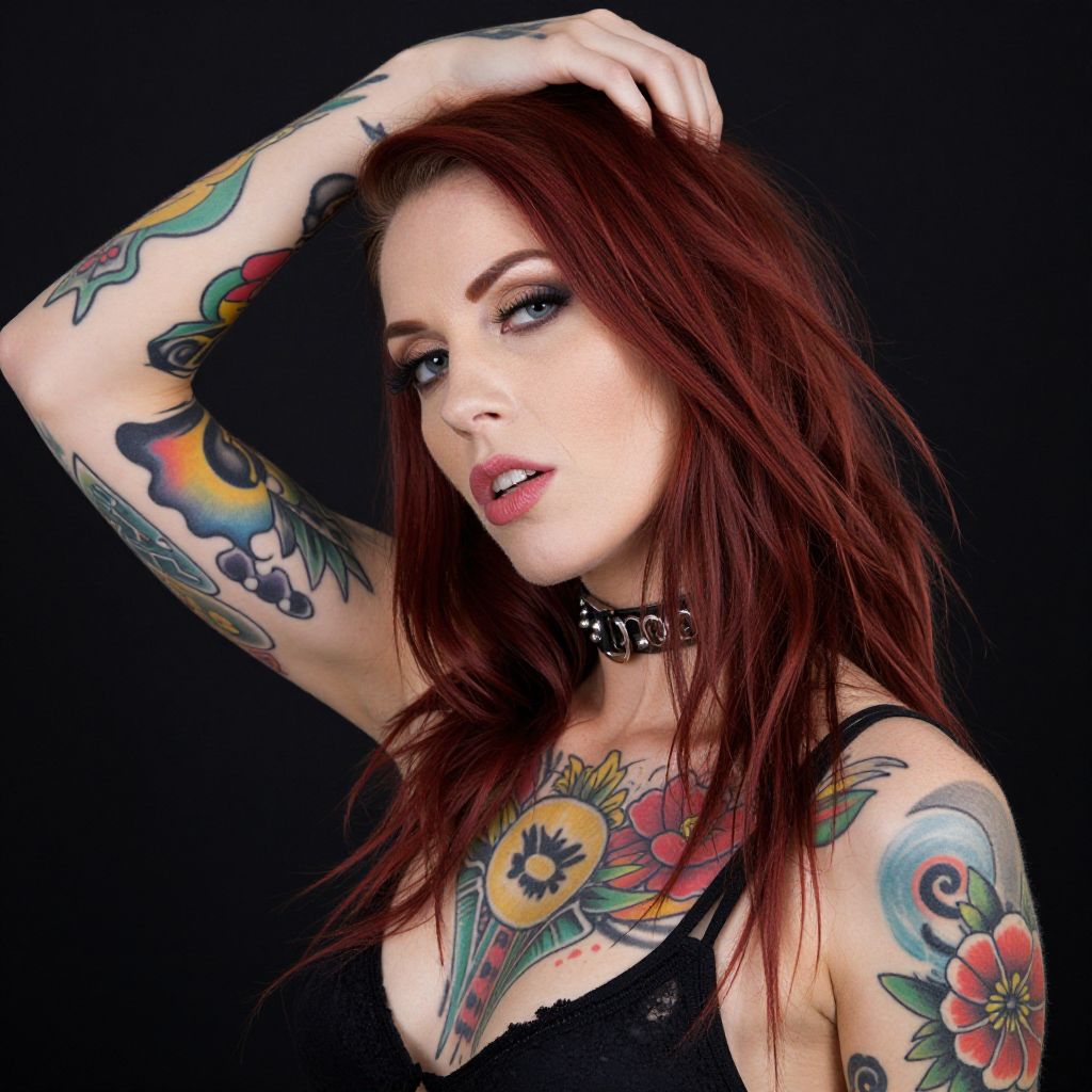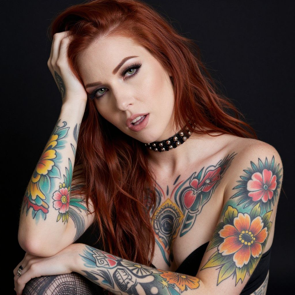 Photograph of a heavily tattooed woman with long, red hair against a black background. She's wearing a black choker and has her right hand raised, touching her head. Her arms and chest are covered in colorful tattoos, including floral and abstract designs. She has pale skin and a confident, slightly sultry expression. The image is bright, with a high contrast between her tattoos and the dark background.