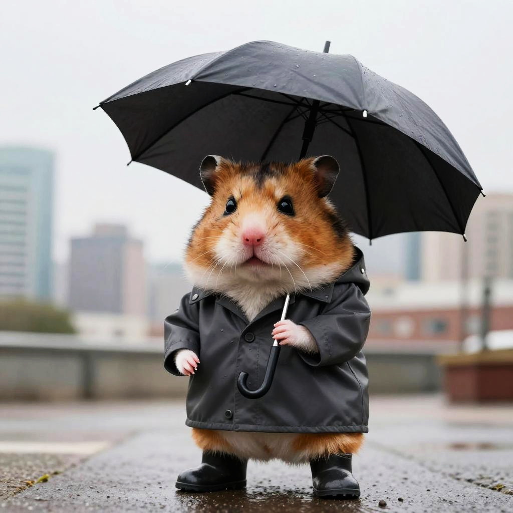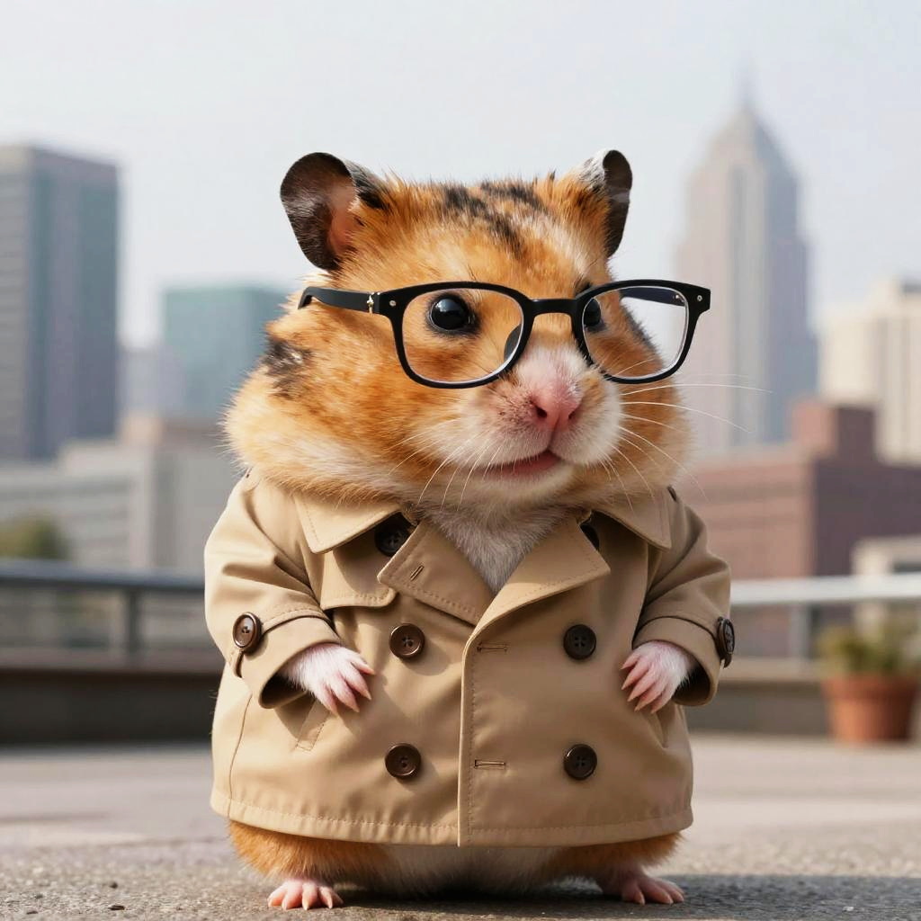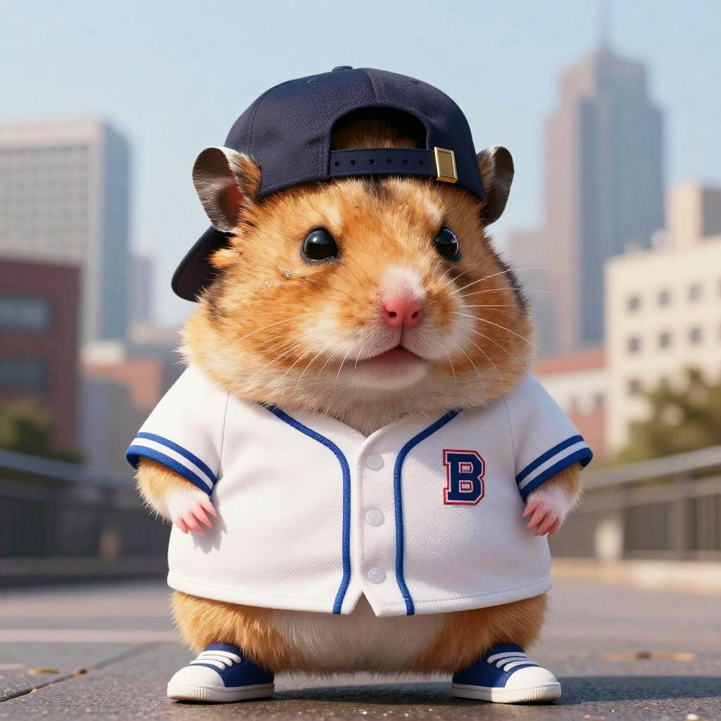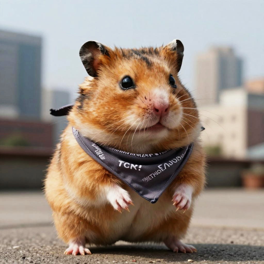 A caricature of an agitated male hamster with exaggerated facial features including a furrowed brow, droopy eyes, and a wet nose. The small hamster has an oversized head and compact body, wearing a blue vest and matching cap. The background features a blurred city skyline with tall buildings, creating an urban setting.