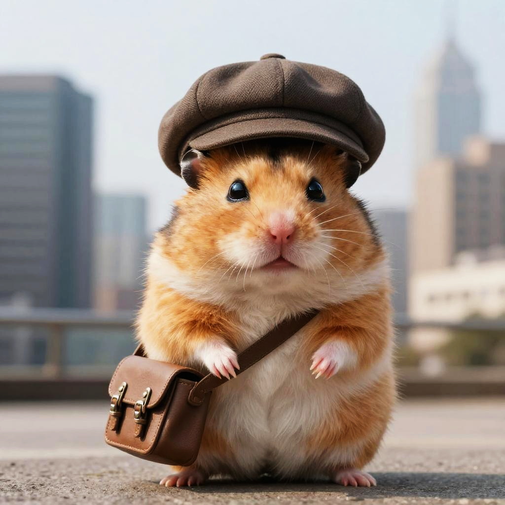 Funny caricature, irritable hamster, male, 7 years old, agitated, small hamster, with an oversized head, tiny body, and exaggerated facial features, compact body type, furrowed brow, droopy eyes, wet nose, irritated expression, caricature, the urban dog is wearing a vest and cap, standing pose, blurred city skyline background