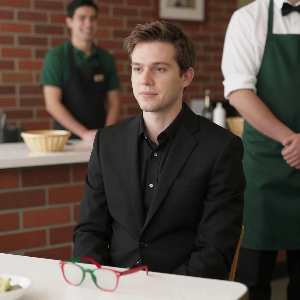Man with short brown hair, black suit, black shirt, seated, looking slightly to the side. Brick wall background. Red and green glasses on table, basket on counter. Partially visible waiter in white shirt, green apron, standing on right. Another man in green shirt, black apron, standing in background, smiling. Casual restaurant setting.