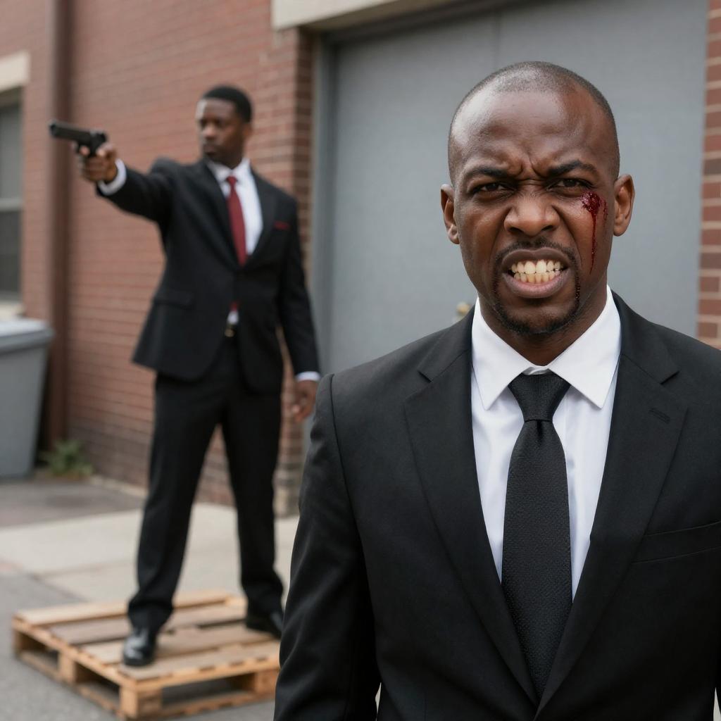 Photograph of two people against a red, ured wall. A black man with short afro, wearing a pink shirt, white t-shirt, and black boots, holds a gun and dances with arms outstretched. A white man with blonde hair, wearing a black jacket and white sneakers, stands to the right, holding a gun and looking at the black man. The ground is wet and dirty. The black man's expression is intense, while the white man's expression is neutral.