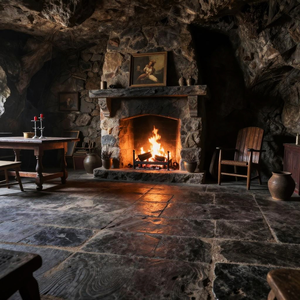 Interior of a rustic cave room featuring a stone floor and stone walls. A fireplace with a fire burning inside is surrounded by stone masonry. The room contains wooden furniture, including a table with red candles and chairs. The dim lighting highlights the natural textures of the cave interior, creating a cozy and warm atmosphere.