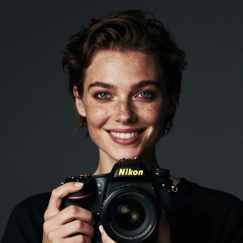 Photoshoot, photo studio, RAW photo, editorial photograph, film stock photograph, cinematic, posing, beautiful lady, (freckles), big smile, blue eyes, short hair, dark makeup, hyperdetailed photography, soft light, head and shoulders portrait, cover, engulfed in shadow, silhouette, dark atmosphere, ((focused on eyes)), feminine expressions, photography, 35mm, Nikon D850 film stock photograph, Kodak Portra 400 camera f1.6 lens, 8k, UHD