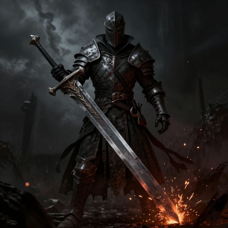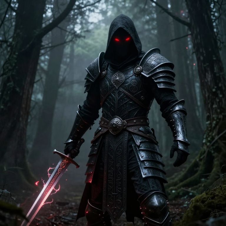 Trinity necromancer who draws a sword, dressed in a ragged tunic and has a hood, and a metal breastplate. Whole body,
