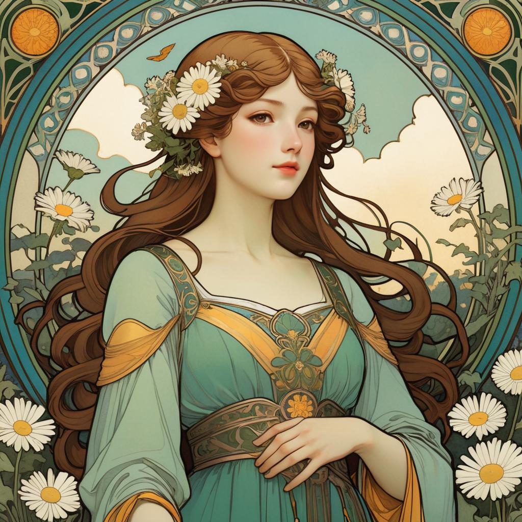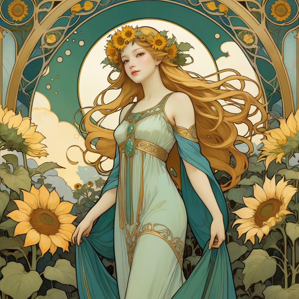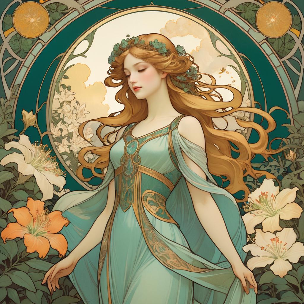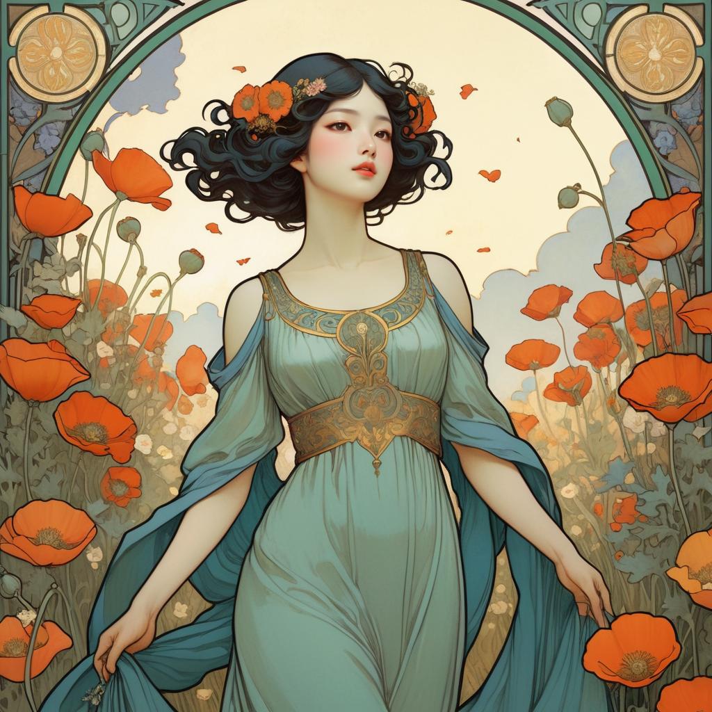 An Art Nouveau style illustration of a graceful woman standing in a vibrant poppy garden. She wears a flowing teal gown with golden intricate patterns and has short, curly black hair adorned with red poppy flowers. A golden halo surrounds her head, enhancing the sacred, serene atmosphere. The background features a soft yellow sky with whimsical botanical details and orange poppies scattered around.