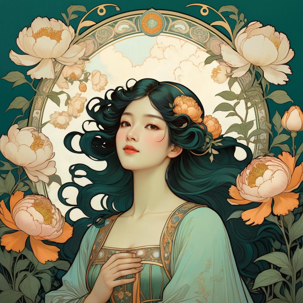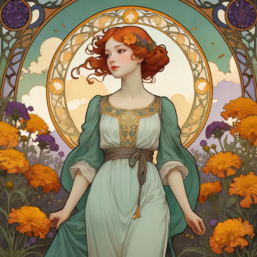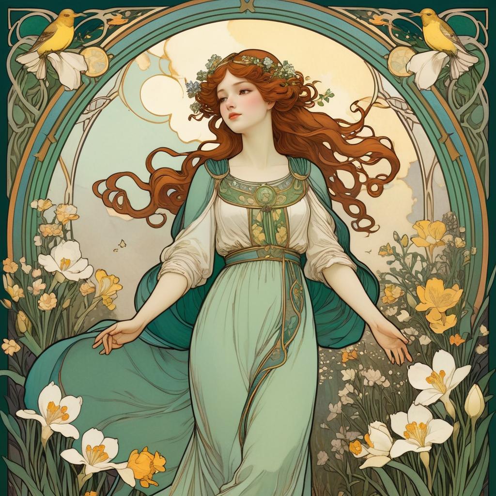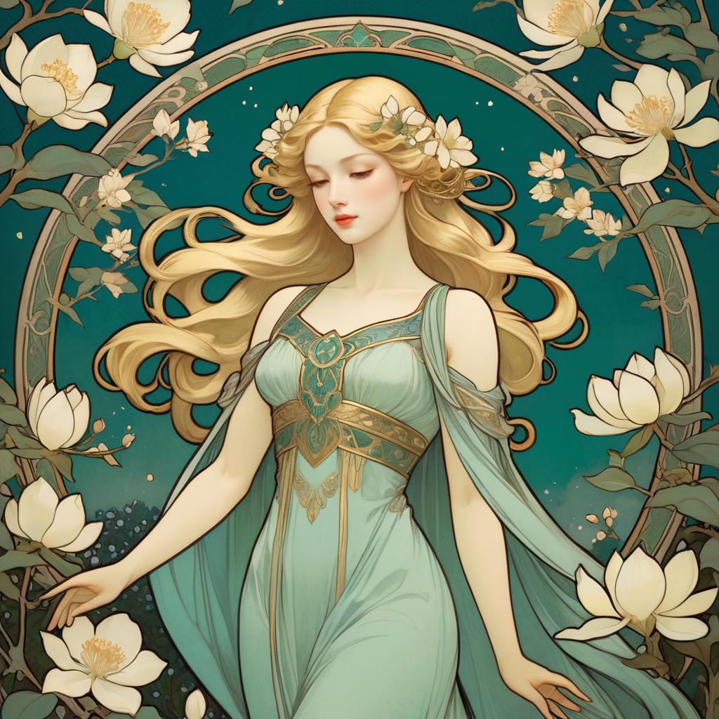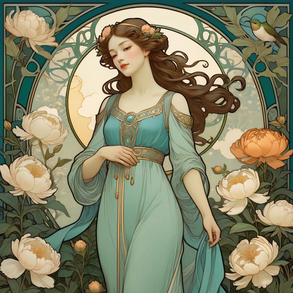An Art Nouveau style illustration of a graceful woman standing in a vibrant poppy garden. She wears a flowing teal gown with golden intricate patterns and has short, curly black hair adorned with red poppy flowers. A golden halo surrounds her head, enhancing the sacred, serene atmosphere. The background features a soft yellow sky with whimsical botanical details and orange poppies scattered around.