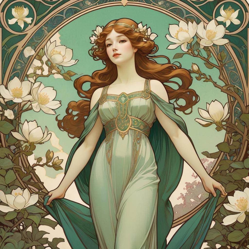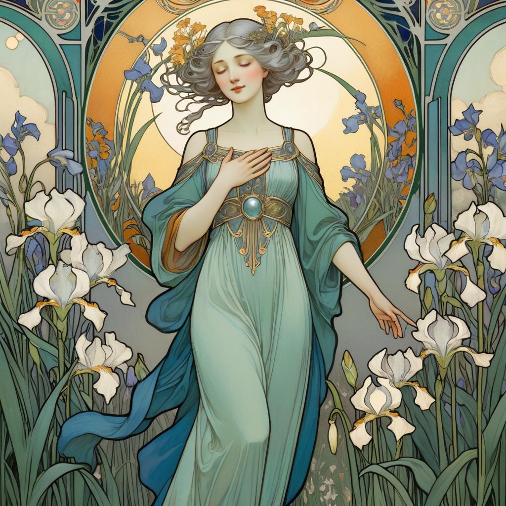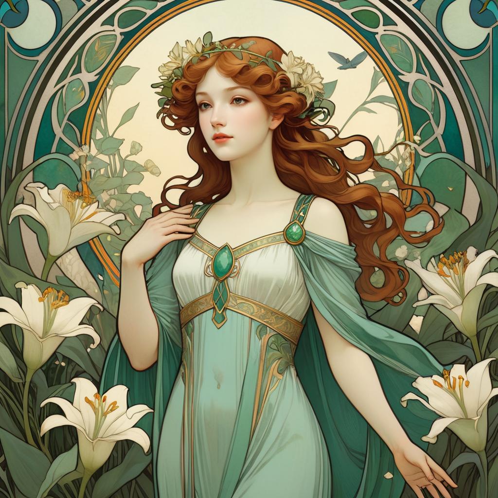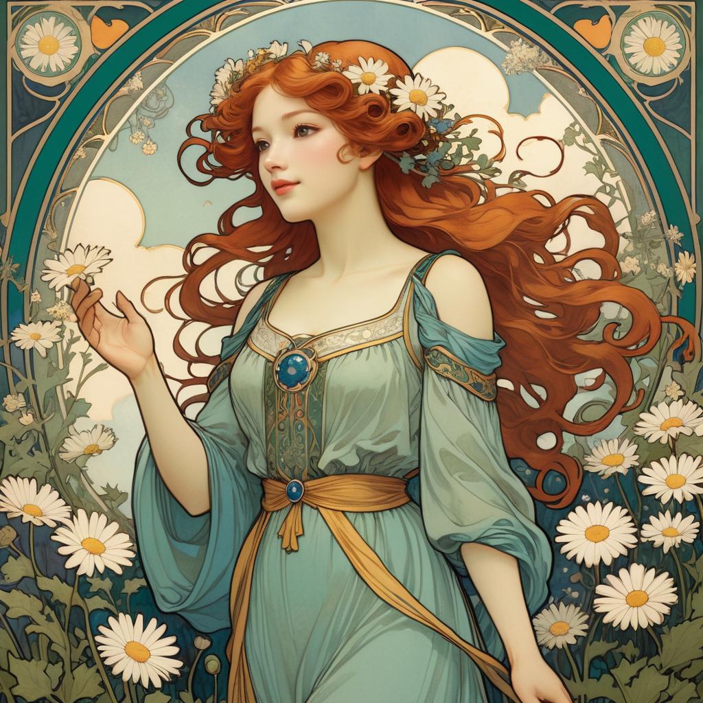 An Art Nouveau style illustration of a graceful woman standing in a vibrant poppy garden. She wears a flowing teal gown with golden intricate patterns and has short, curly black hair adorned with red poppy flowers. A golden halo surrounds her head, enhancing the sacred, serene atmosphere. The background features a soft yellow sky with whimsical botanical details and orange poppies scattered around.